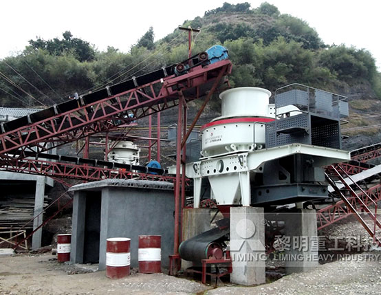 经过客户现场的实地考察和公司的技术指导,为客户推荐了三段破碎。第一段先由颚破PE900×1200进行粗碎,粗碎后的物料进入中转料仓,由给料机把其分离成0-50mm和大于50mm的料,0-50mm直接进入4YZS2460振动筛;第二段是将大于50mm的物料进入第一个CS160B圆锥破进行破碎,后进入振动筛筛分成6.25mm、9.37mm、18.75mm、37.5mm的料,大于37.5mm的物料进入第二个圆锥破CS160D进行第三段破碎,0-6.25mm的物料进入洗砂机制出成品料。