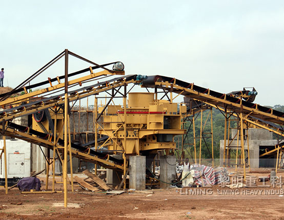 物料由振动给料机输送给PE1200×1500颚式破碎机进行粗破,粗碎后的物料则经由1号地下中转料仓进入HST315单缸液压圆锥破进行中细碎,后经四台4YK2675圆振动筛筛分后,物料粒度大于36mm和38mm的则经由2号地下中转料仓再次进入HPT500多缸液压圆锥破进行中细碎,破碎后的物料由振动筛筛分后,5-24mm的物料则进入5X1145制砂机进行整形筛分,后经由3YZS2675圆振动筛筛分后,最终的砂石成品粒度为:0-5mm、3-5mm、5-10-24-36-38mm。
